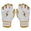 HIGHEST QUALITY, MOST DURABLE BATTING GLOVE IN BASEBALL: Each pair of BRUCE BOLT batting gloves are handmade by skilled craftsmen. Our GOLD Series gloves use 1.2mm Cabretta leather on the palm and the back of the glove which makes them buttery soft and more durable while providing better grip than any other glove on the market.